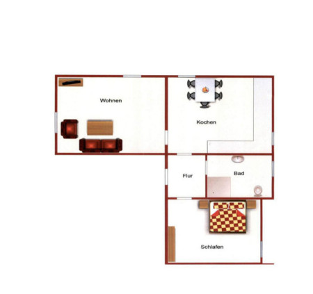 Im Wohnzimmer steht eine bequeme Schlafcouch mit ausreichender Liegefläche (160x200) für 2 Personen. Im Schlafzimmer können Sie in einem Doppelbett träumen. Das Duschbad bietet genügend Platz. Die Küche bietet eine gemütliche Sitzecke und ist mit Kühlschrank, Backofen, Microwelle und weiteren kleinen Küchenhelfern ausgestattet.